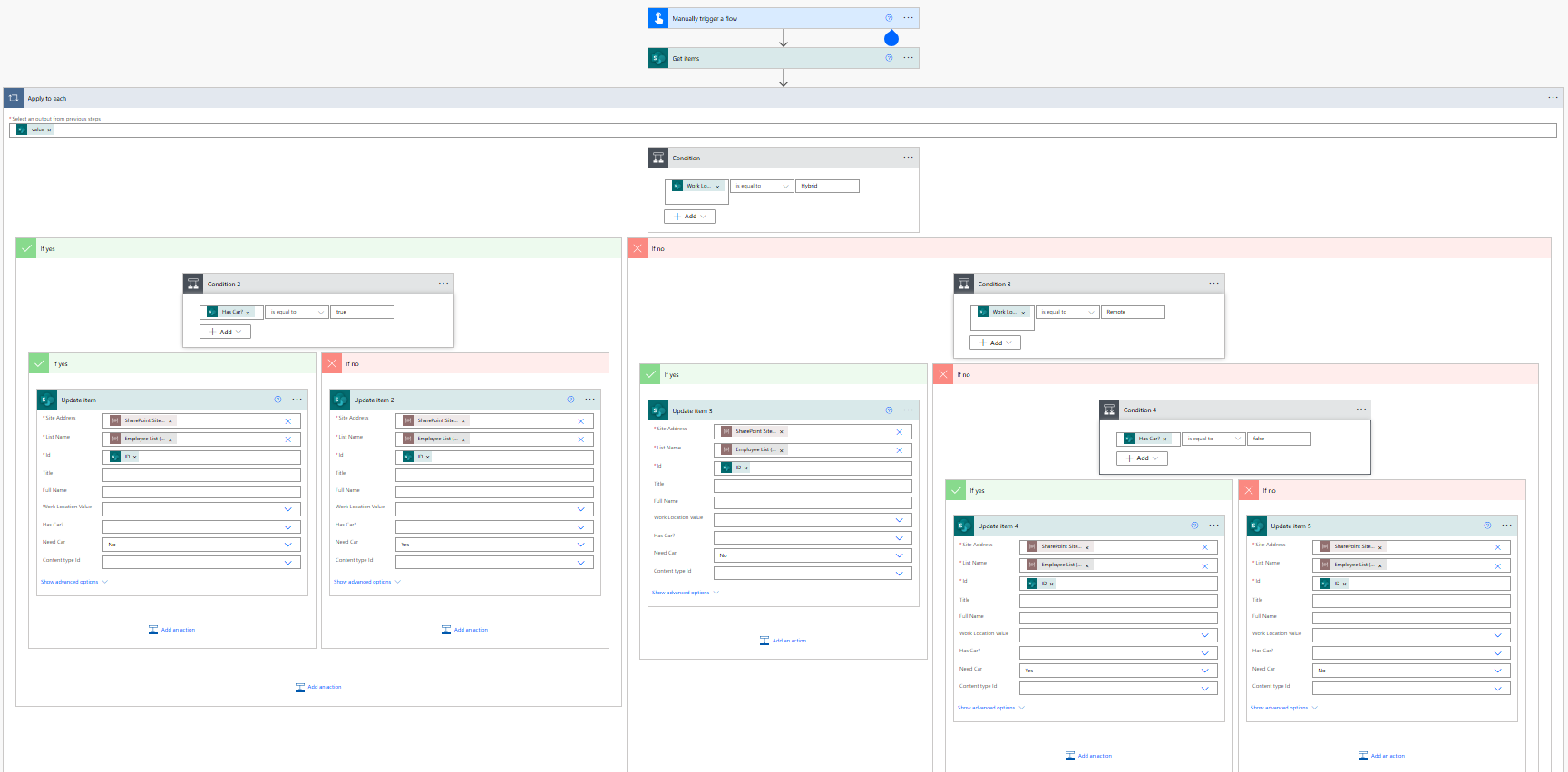 and(equals(items('For_each')?['WorkLocation/Value'], 'Hybrid'), equals(items('For_each')?['HasCar_x003f_'], false)),