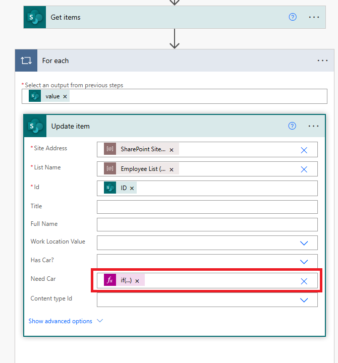 and(equals(items('For_each')?['WorkLocation/Value'], 'Office'), equals(items('For_each')?['HasCar_x003f_'], false)),