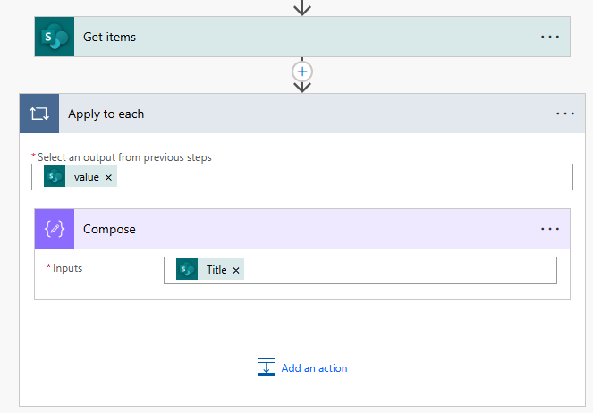 From the apply to each we need the ‘value’ which will look something like below