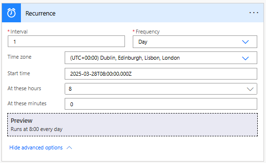 To set up reminders in Power Automate we first need to to use a scheduled trigger, this means that on a schedule Power Automate will check to see if an order has expired and an email will be sent to the user on the schedule. First of all we need to set the frequency and time the flow will trigger.