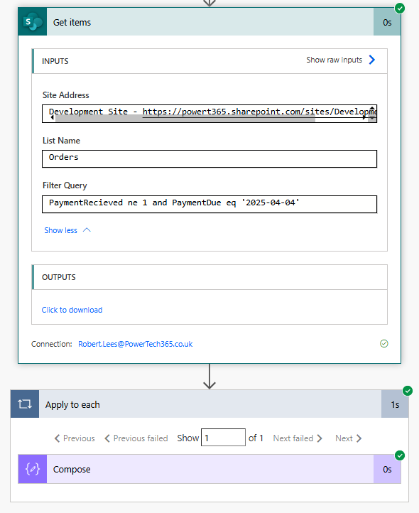 PaymentRecieved ne 1 and PaymentDue eq '@{formatdatetime(addDays(utcNow(),7),'yyyy-MM-dd')}' After we do this we can now see the flow has returned 1 record as expected