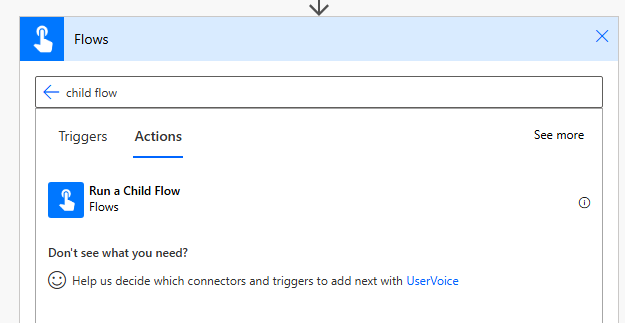 To run the child flow we need to select as the action ‘Run a Child Flow’ and select the flow we created previously from the drop down.