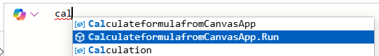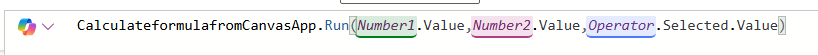 CalculateformulafromCanvasApp.Run(Number1.Value,Number2.Value,Operator.Selected.Value).result)